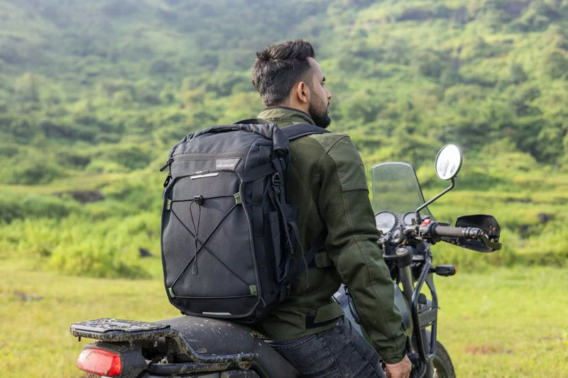 Mounts on your motorcycle and transforms into a ventilated, ergonomic backpack when needed.