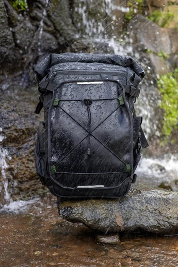 Yes — it uses a roll-top design plus a seam-sealed removable liner to offer complete protection from rain and dust.