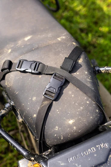 3. Pass the straps through the loops on the bag and buckle it beneath the beavertail for a clean setup — always fasten securely to prevent movement during rides.